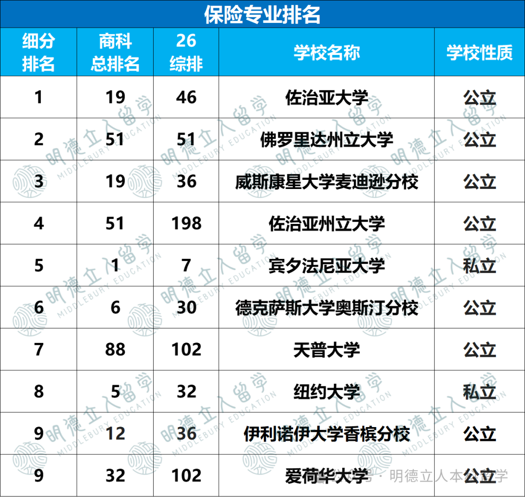 保险专业的第1名由佐治亚大学获得,毕业生在保险行业内受到广泛认可。