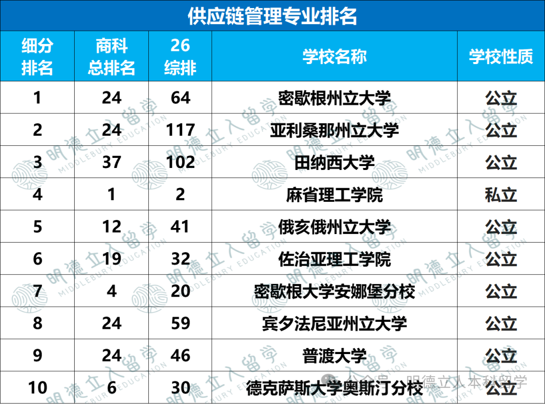 除了一些常见上榜前10的学校外,田纳西大学、宾夕法尼亚州立大学都是商科总排名比较靠后的学校,在供应链管理专业分列第3名、第8名,也是属于实践性比较强的属性。