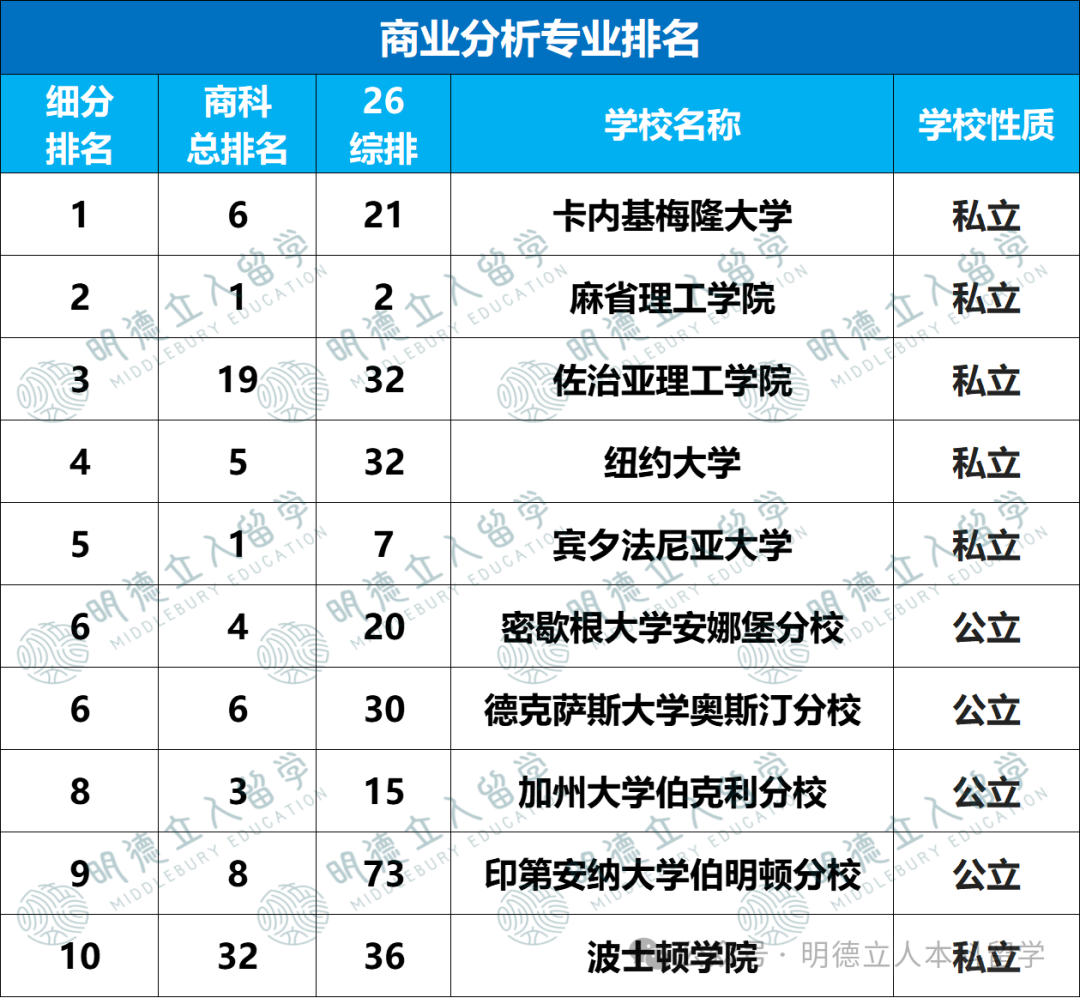 商业分析涉及不少理科要求的课程,比如微积分、概率等数学基础,还有编程语言、数据结构与算法等计算机科学基础,因此理科强校在该领域表现十分强势。