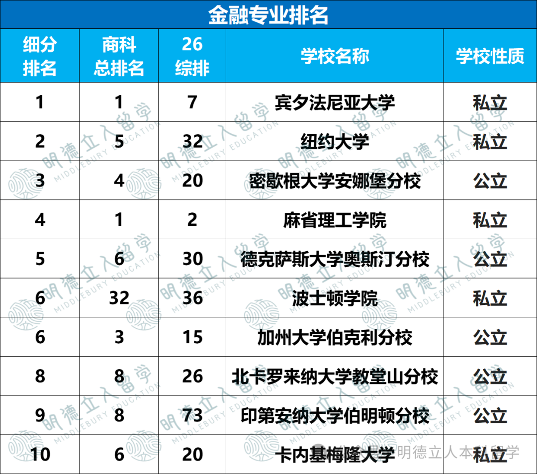 密歇根安娜堡分校、德州奥斯汀和UCB三所公立校紧其后,综排比较低调的BC在金融领域表现也十分突出,排在全美第6。