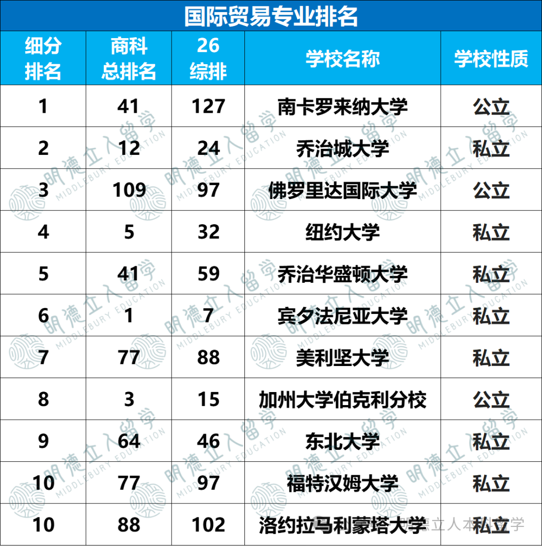 另外在13个细分专业很少上榜前10的乔治城大学,在国际贸易专业能排到全美第2。