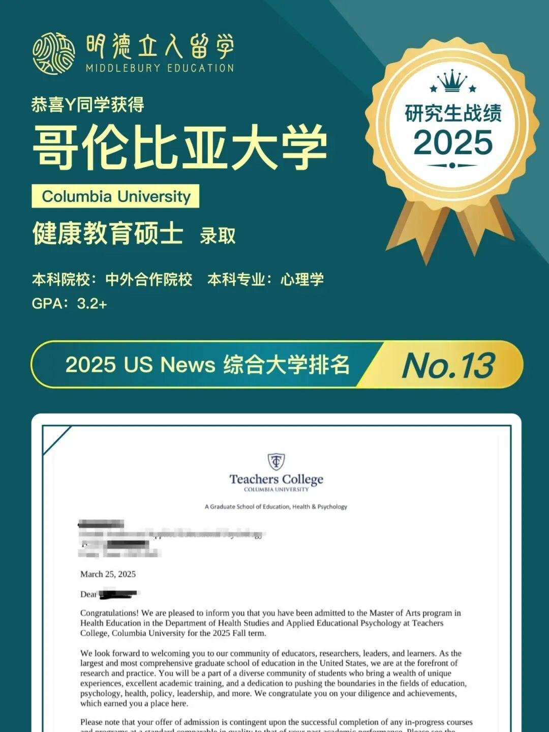 最终以GPA 3.2+、无托福成绩,成功斩获全美TOP1教育学院录取,实现低分逆袭。