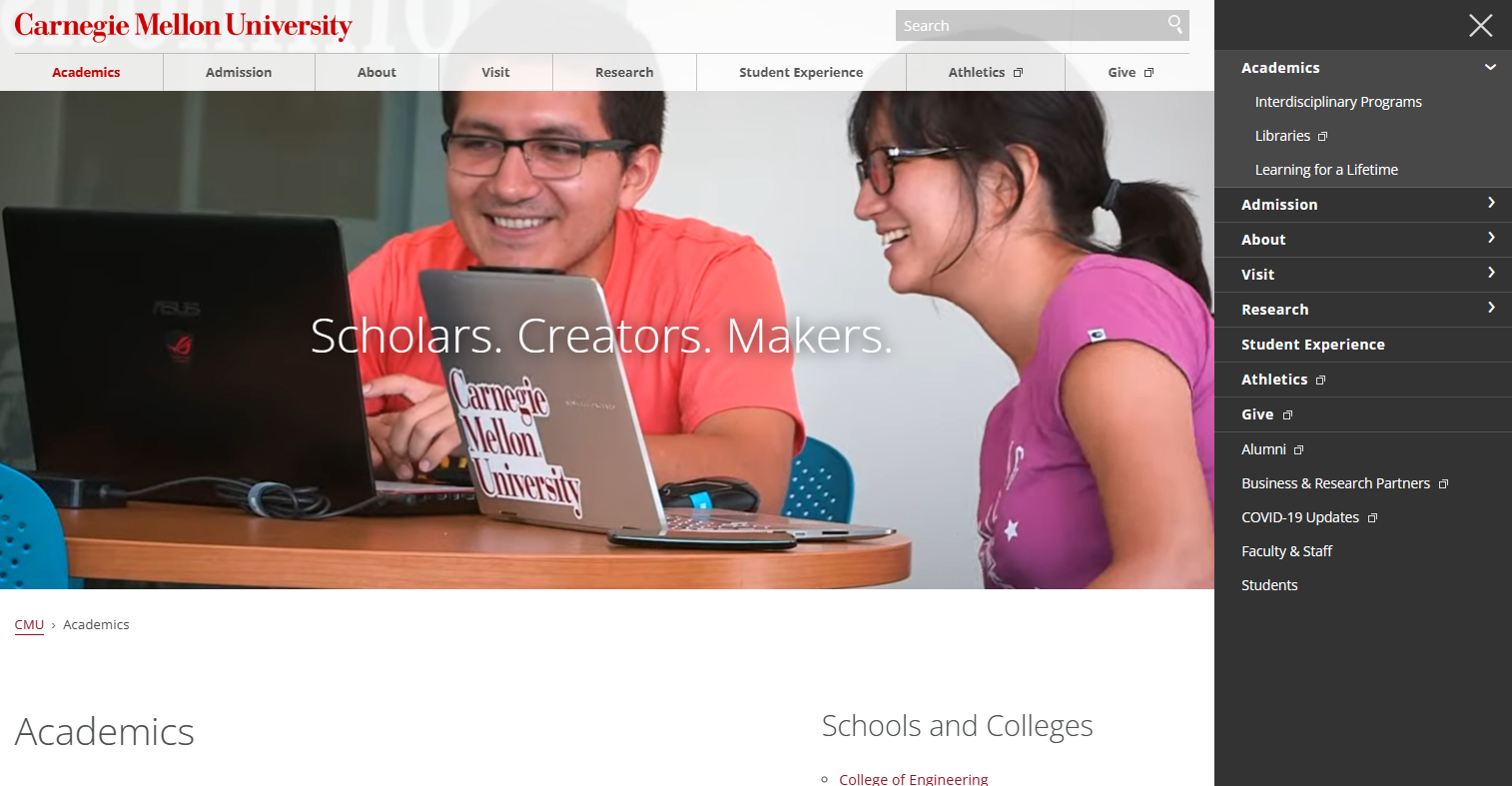卡内基梅隆大学(Carnegie Mellon University)有享誉全美的管理和公共关系学、写作和修辞学、应用历史学、哲学和生物科学专业。它的计算机专业,与麻省理工学院、斯坦福大学和加州大学伯克利分校并列全美榜首,卡内基梅隆大学的软件工程专业更是遥遥领先于其它名校??诨仿〈笱г诠嗜砑到缬涤屑叩纳嗜砑幸底钔ㄐ械谋曜?--Capability Maturity Model for Software软件生产能力成熟度模型(CMM)正是由该校的软件工程研究院研发并制定的。近年来卡内基梅隆大学在原有的CMM体系基础上又推出了CMMI最新体系,成为软件行业最新标准。 卡内基梅隆大学的软件工程研究院成为美国国防部军管研究院,成为全球软件学院的楷模。全球500强企业中IT巨头们纷纷在卡内基梅隆大学捐款并设立研究所,正因如此卡内基梅隆大学对入学学生要求之高成为全球瞩目。 卡内基梅隆大学在科技方面的学术表现可圈可点,举凡计算机科学、机器人学(robotics)、电机工程等,在各自领域内都占有领导性地位。其中,计算机科学最为著名,所涵括的软件工程(Software Engineering)、电子商务(E-Commerce)、资讯管理系统(Management Information Systems)、生产控管(Production/Operations Management)等都有出色的表现。