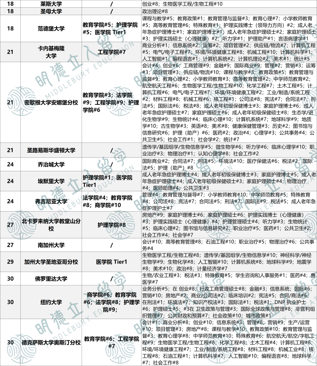 无论是Top 10的顶尖学府还是Top 30的优秀大学,每个学校都有其独特的优势和强势专业。