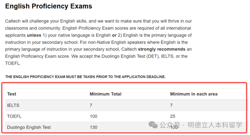 加州理工学院对各项小分都做出了具体要求:雅思最低7分 (各项小分7.0+);托福100分(各项小分25+);多邻国最低130(各项小分130+)。