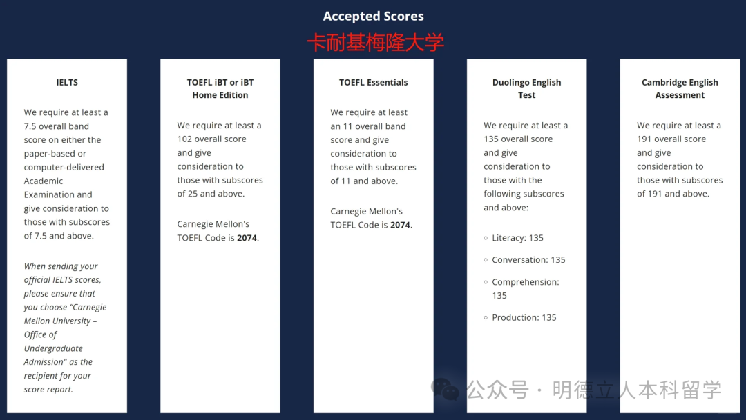 卡耐基梅隆大学托福总分至少102,单项不低于25;不仅有小分要求,对于2026Fall还调整了多邻国单项成绩要求: