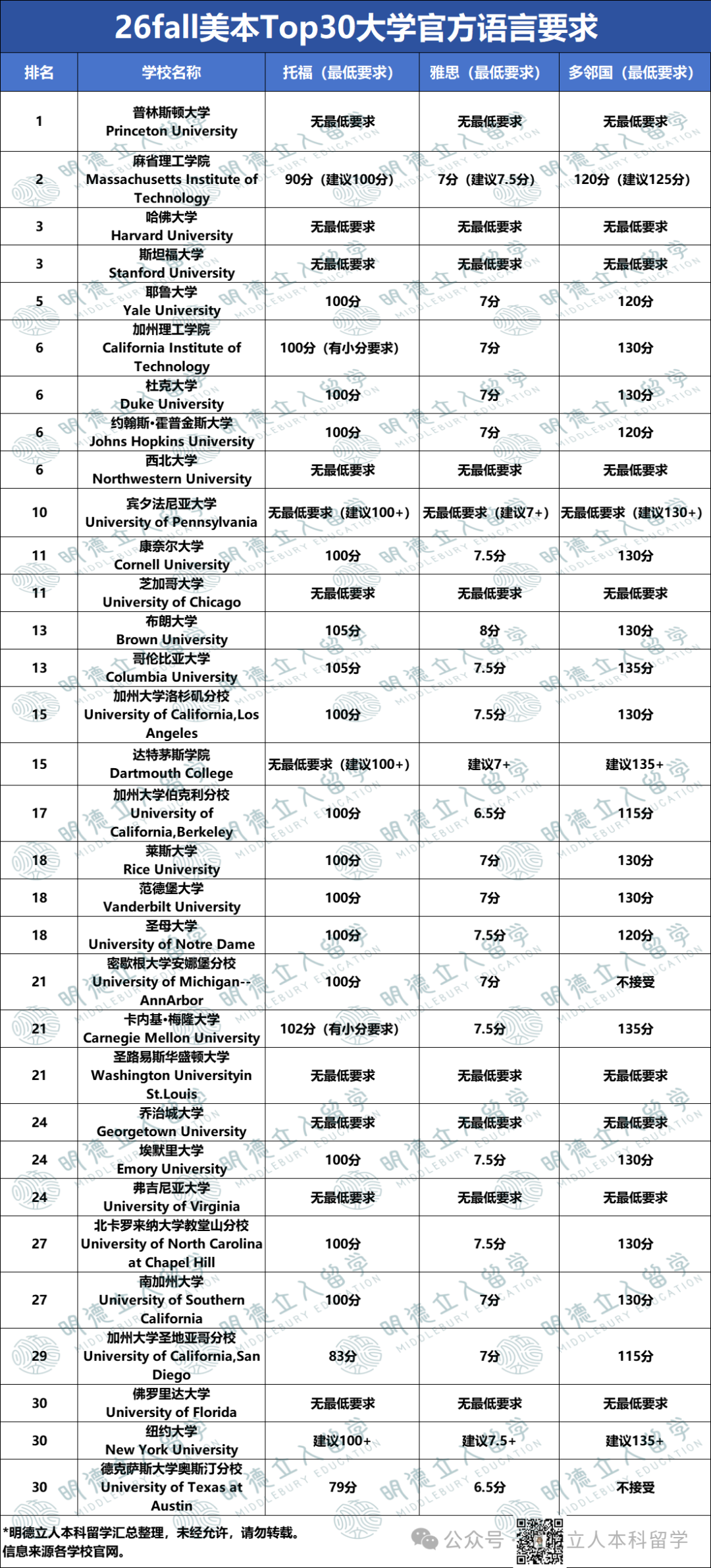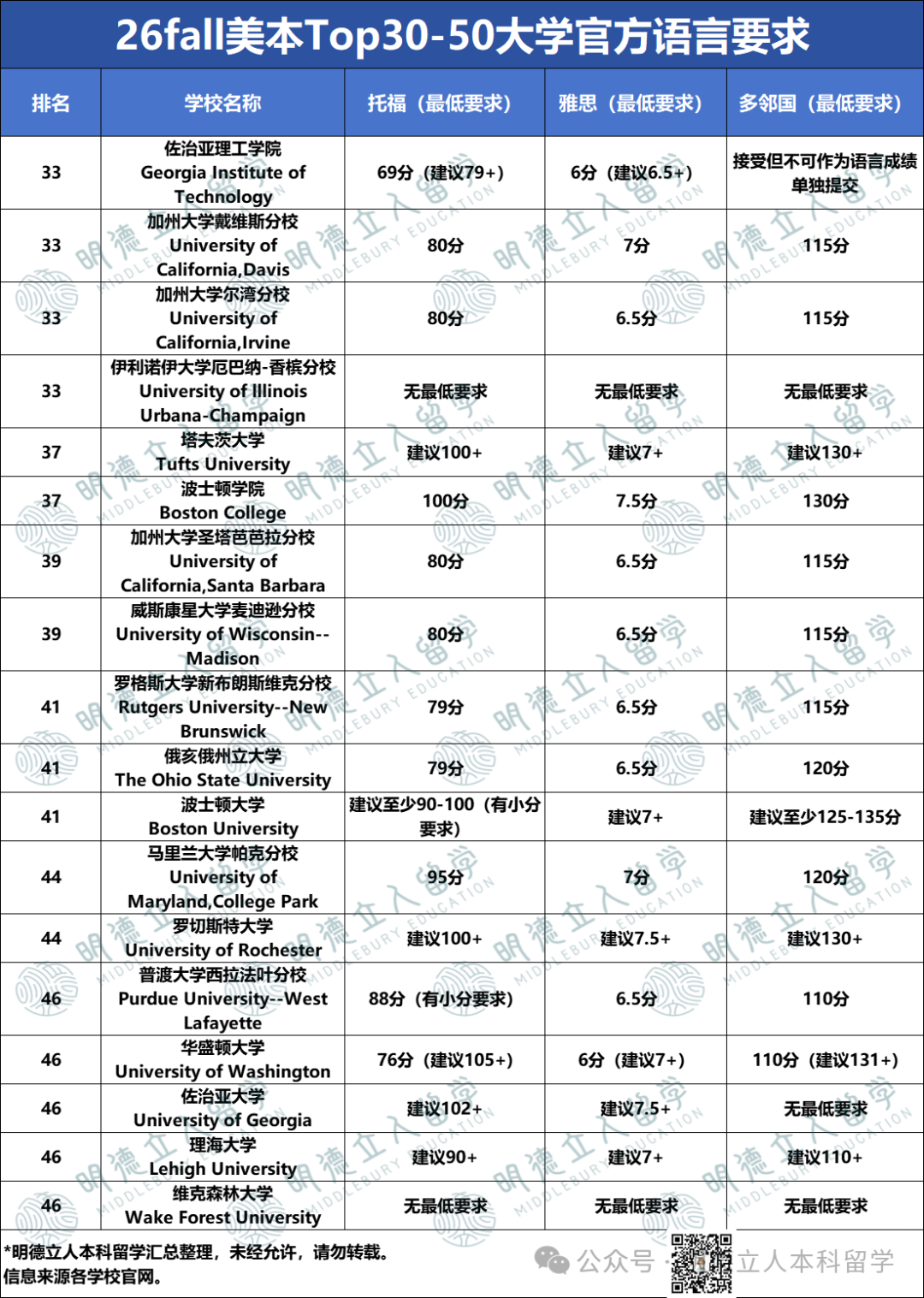 特别提醒,对于TOP50大学针对所有申请者的最低语言要求成绩,低于要求的申请者是不会被考虑的。