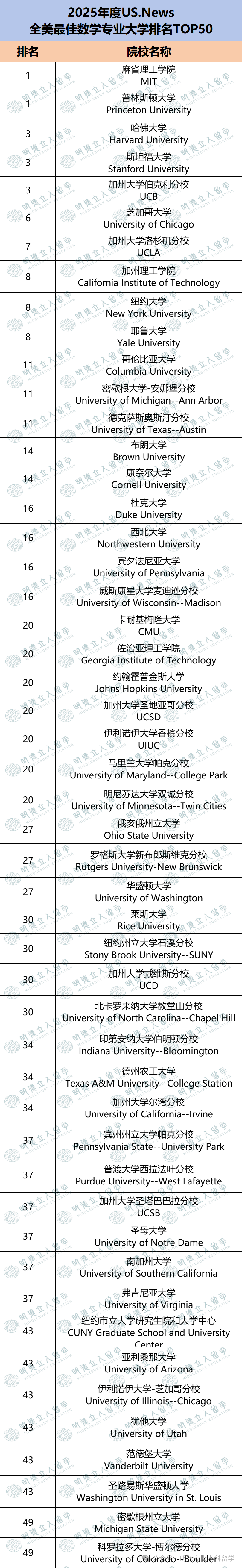 那么,哪些美国大学的数学专业比较强呢?小藤结合2025US.News美国大学数学专业排名,先给大家做个科普。