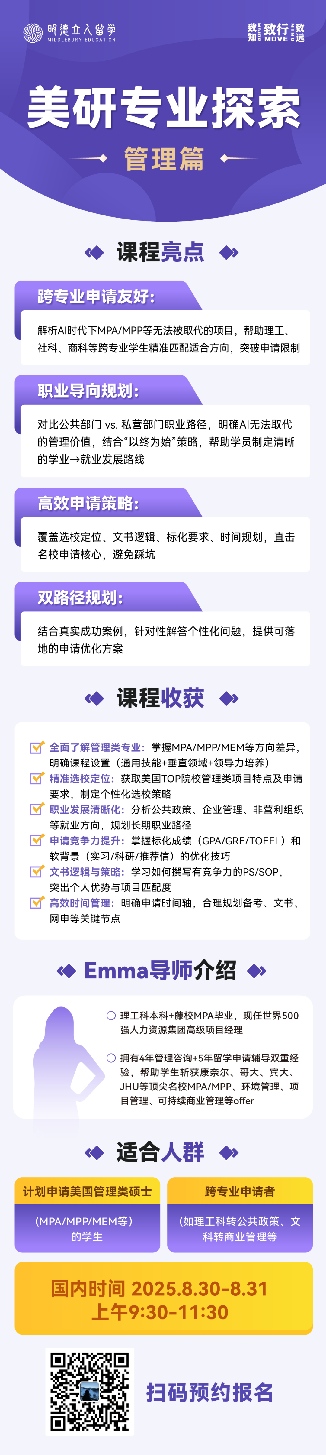 ?? 课程亮点: ? 跨专业申请友好:解析AI时代下MPA/MPP等无法被取代的项目,帮助理工社科、商科等跨专业学生精准匹配适合方向,突破申请限制! ? 职业导向规划:对比公共部门 vs.私营部门职业路径,明确AI无法取代的管理价值,结合“以终为始”策略,帮助学员制定清晰的学业→就业发展路线。 ? 分享美研管理专业高效申请攻略:从择校、文书、标化要求、时间规划,直击名校申请核心,避免踩坑! ?? 适合人群: 计划申请美国管理类硕士的同学:MPA/MPP/MEM等的学生。 跨专业申请者:如理工科转公共政策、文科转商业管理等。 ?? 时间: 国内时间2025.8.30-8.31上午9:30-11:30 ?? 导师:明德资深管理导师,藤校MPA毕业,现任世界500强人力资源集团高级项目经理 ??上课方式:长按联系小助手,回复关键词【明德】即可。 一手留学资料共享 最新录取案例解读 一对一选校选专业 扫码添加小助手:交流群丨听讲座丨领资料丨做评估
