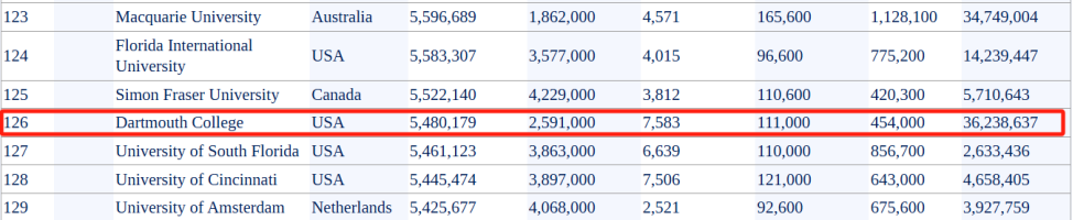 布朗和达特茅斯一个难兄一个难弟,布朗综合排名#84,对比去年第103名有所上升;达特茅斯排名#126,对比其他藤校,差距不是一丁点大。