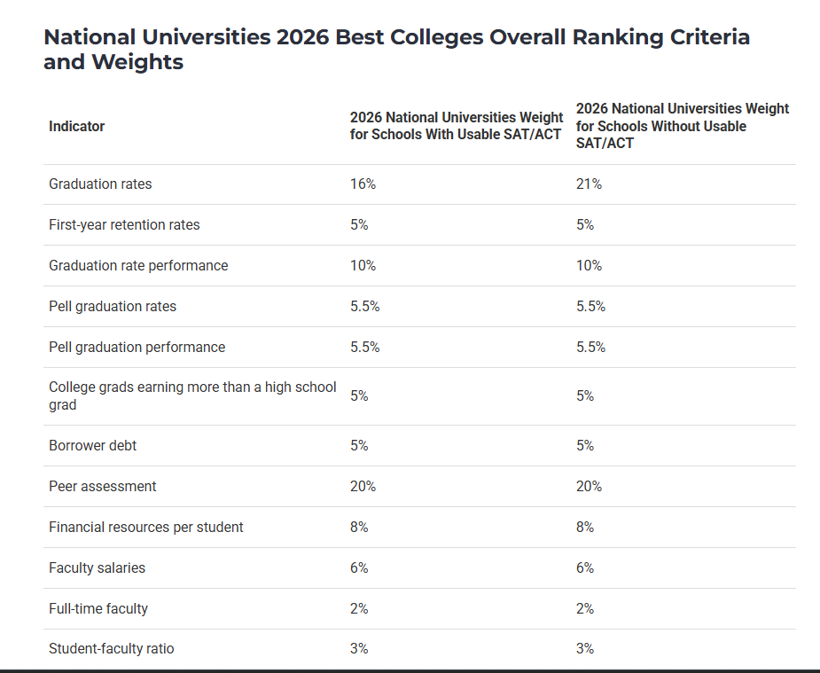 包括学生保留率、毕业生负债、毕业生收入、佩尔助学金毕业率、教师资源(包括班级规模、教师薪资和教师的学术成果等)、专家意见。