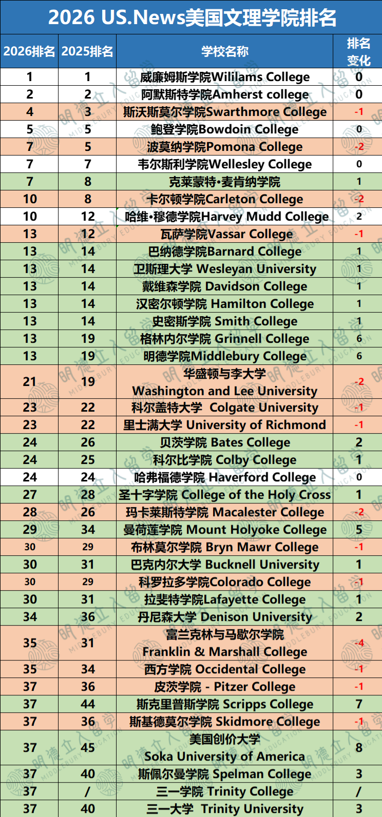 藤校方面,康奈尔大学下降1位排在Top12;达特茅斯学院接连两年迎来了排名的上升,2026年拿到了第13名的好成绩;
