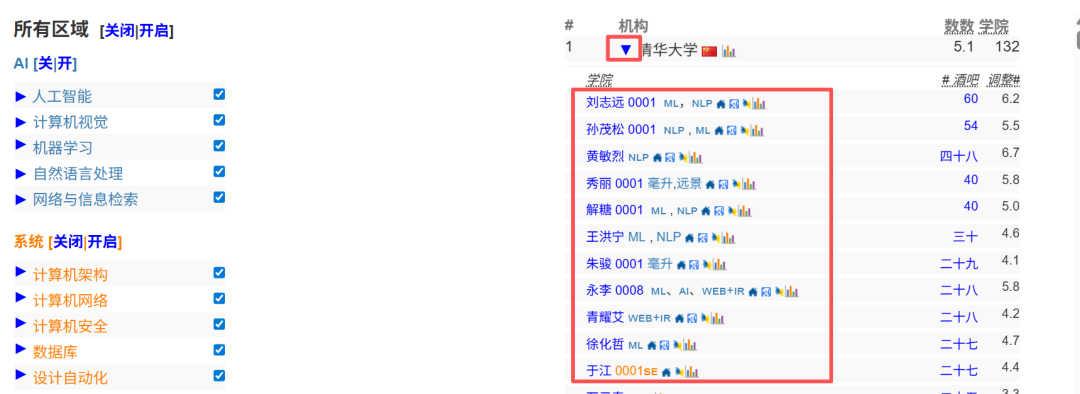 然后是CS Rankings的评价标准,主要依据各大院校顶刊论文数量,科研规模大、产出效率高、专注于前沿热点的院校能够快速脱颖而出,因此部分中国大学的排名“井喷”式提升。