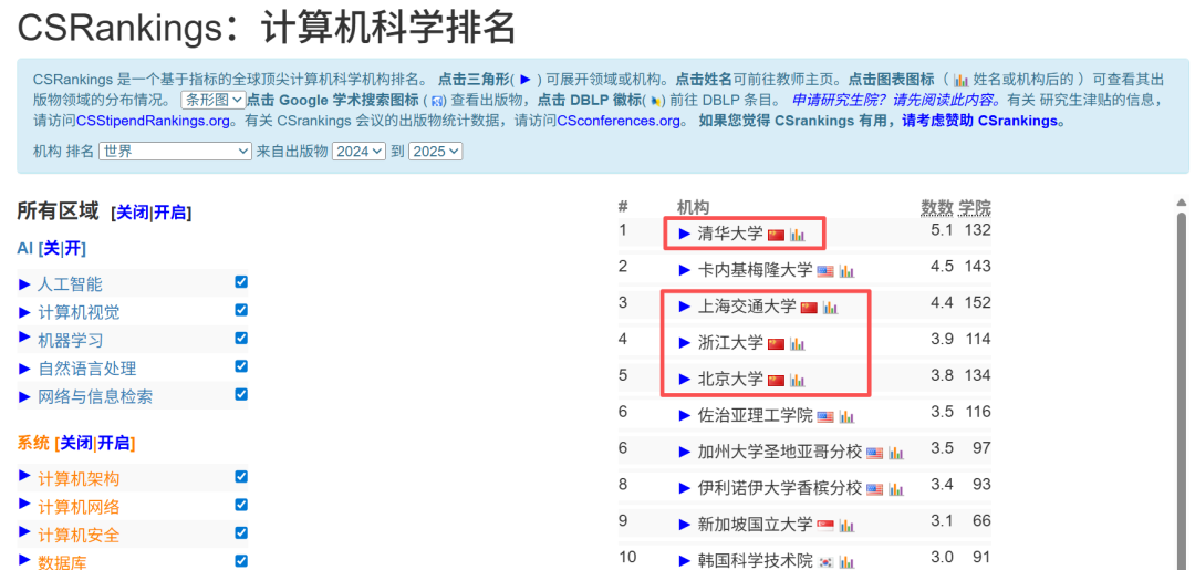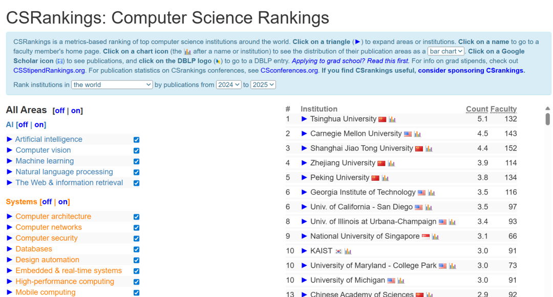 CS Rankings主要依据高校在计算机科学领域顶级期刊和会议上的论文发表数量来进行排名,排名越往上,说明近期发布的顶刊和论文越多。
