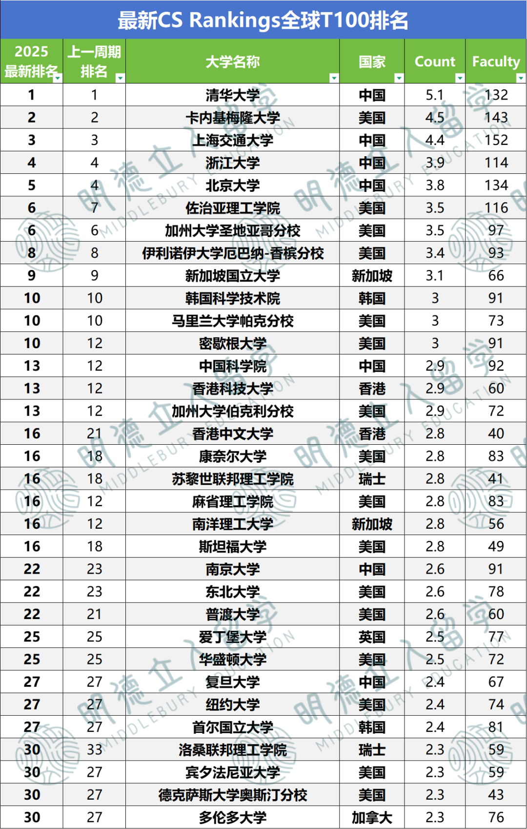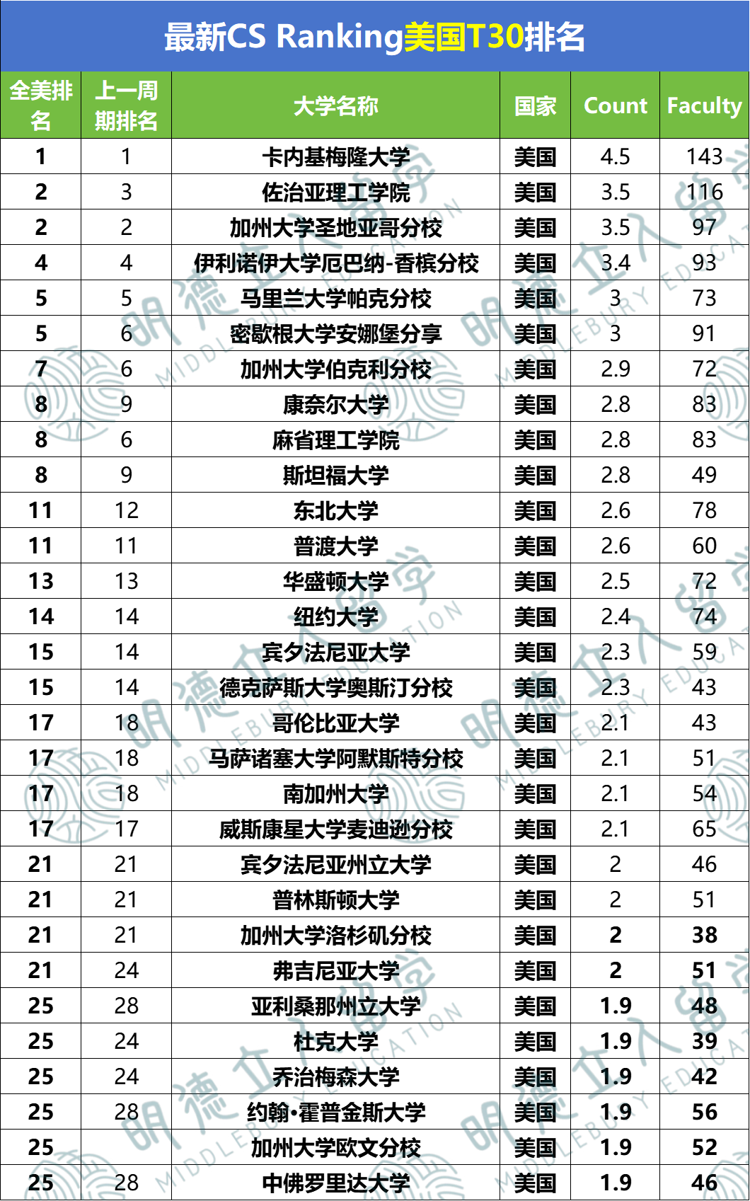 【AI领域】最新全美排名: