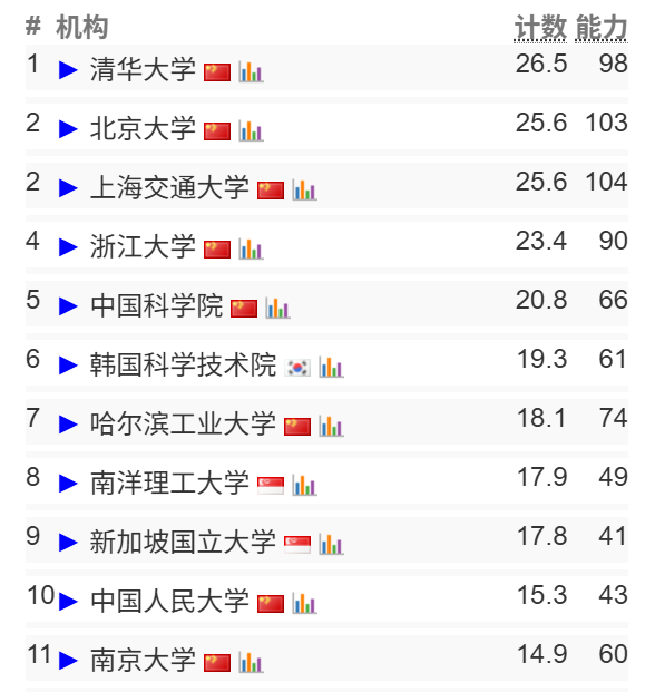 上海交通大学、浙江大学、北京大学,共同进入了全球前四,中国共计26所大学上榜,可以看出中国在CS领域的快速崛起!